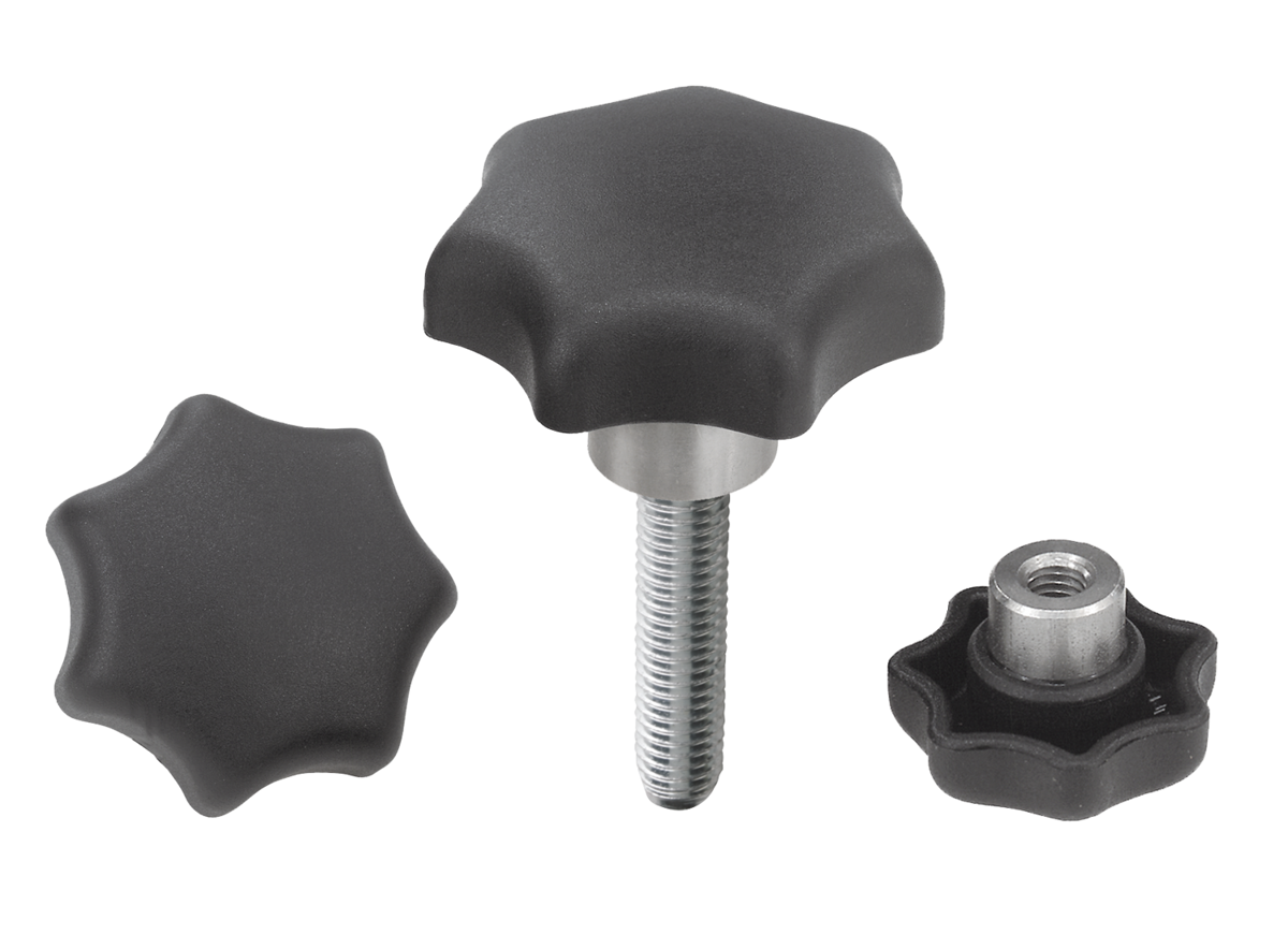 Sterngriffe mit vorstehender Stahlbuchse eignen sich als Sackloch- oder Innengewindeausführung besonders für Querstiftverbindungen.