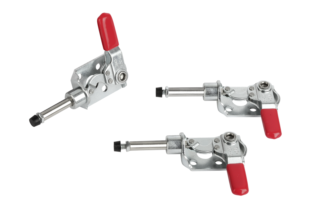Schubstangenspanner mit sehr niedriger Bauhöhe. Die Spanner arretieren in geschlossener und in geöffneter Griffposition. Deshalb können sie auf Druck, wie auch auf Zug, eingesetzt werden.