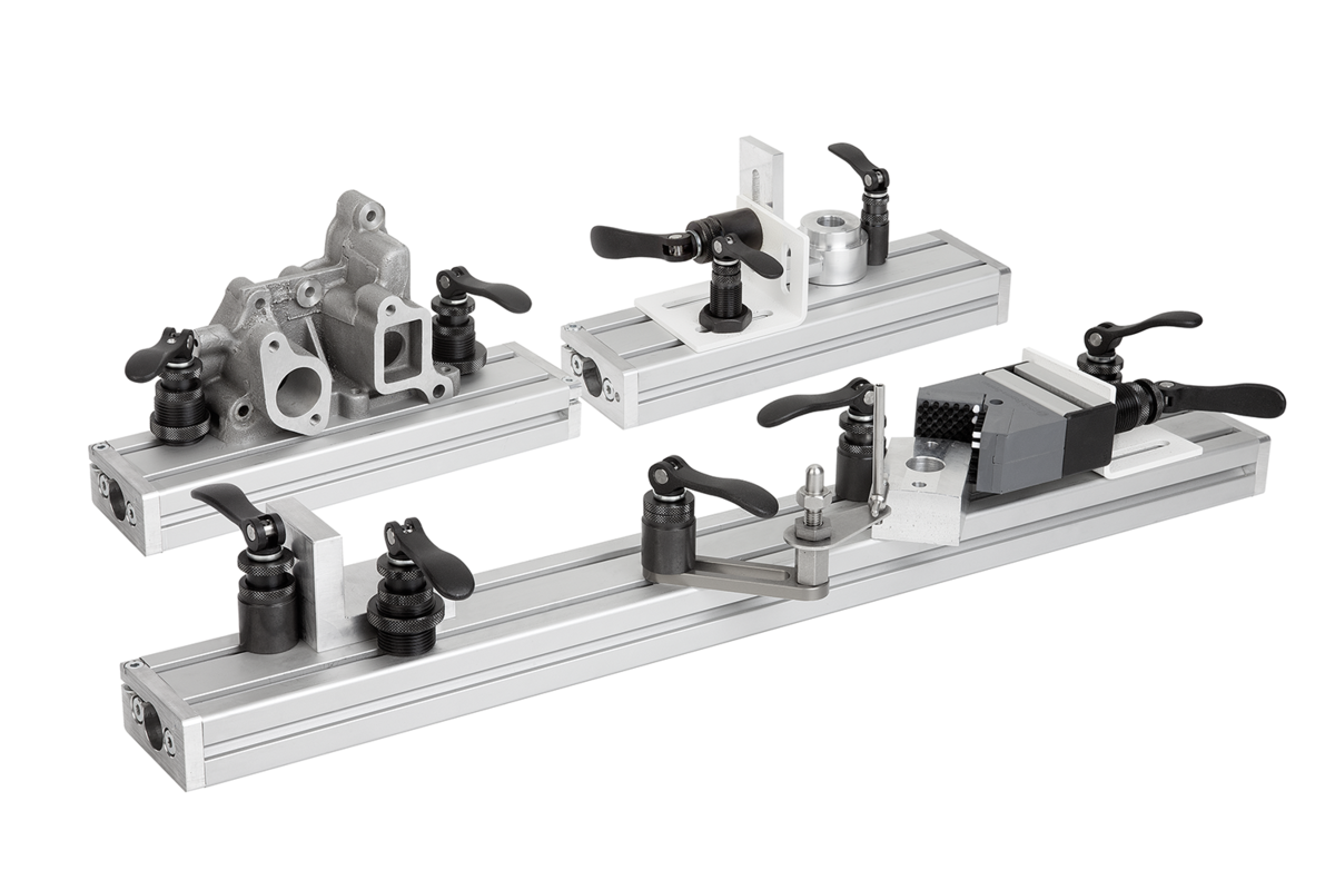 Die Exzenter Spannmodule können auf den gängigen Alu-Profilsystemen oder auf T-Nut-Tischen zum Anschlagen, Festklemmen oder Spannen von Bauteilen und Werkstücken eingesetzt werden.