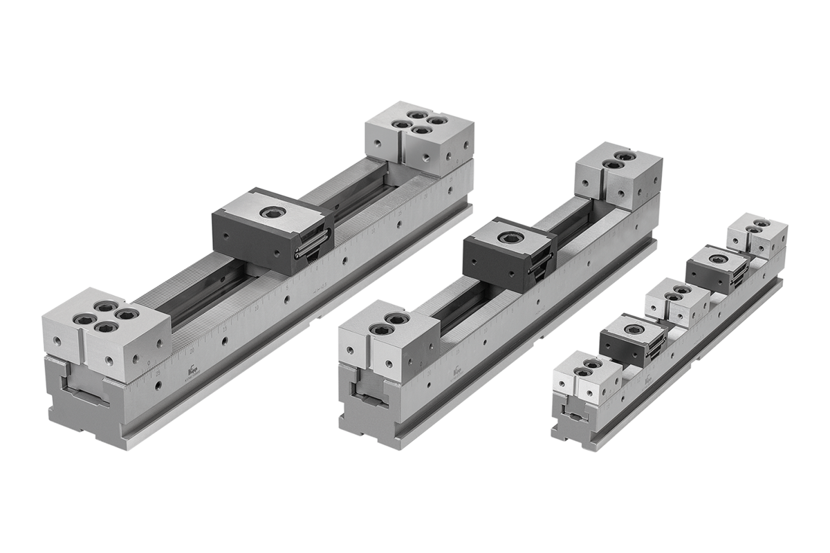 Es können mehrere Mehrfach-Spannsysteme mit unterschiedlicher Länge hintereinander oder nebeneinander montiert werden. Durch die Präzisionsverzahnung ist ein sehr genaues Positionieren der Festbacken möglich. Durch die seitliche Skalierung an den Spannschienen, kann jede Position der Festbacken dokumentiert und im Wiederholfall identisch eingestellt werden. An den seitlichen Gewindebohrungen können Anschläge montiert werden.