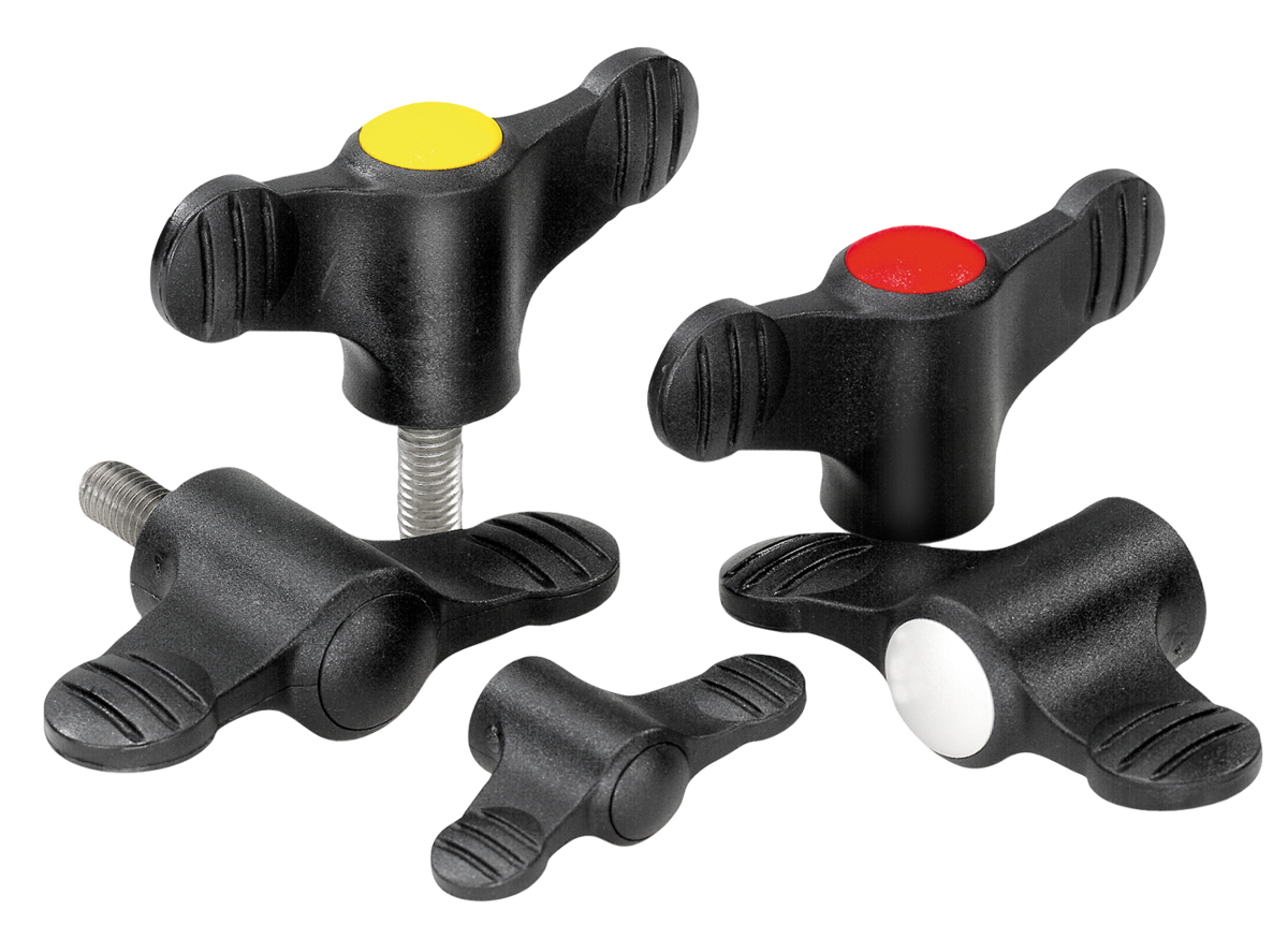 Flügelgriffe Kunststoff mit Deckel, Gewindeeinsatz Stahl oder Edelstahl, mit Außengewinde