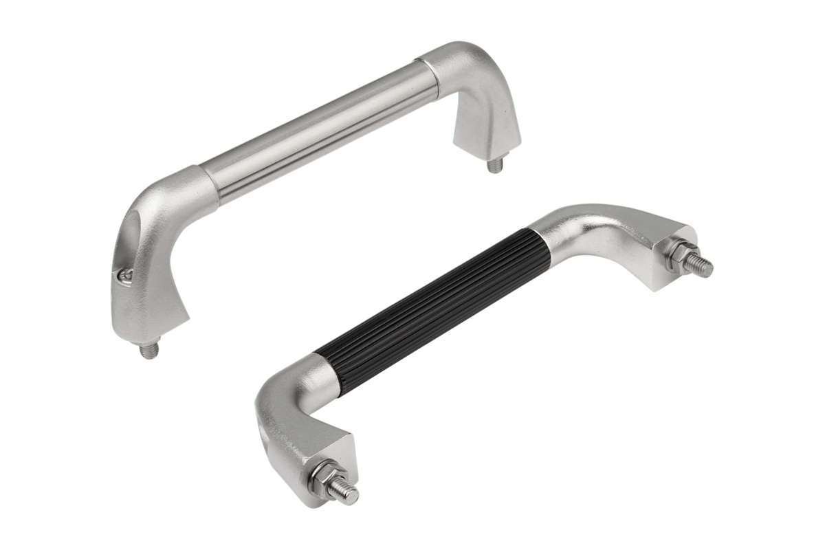 Verbindungsrohr feingeschliffen oder mit geriffeltem Kunststoffüberzug, schwarz. Griffschenkel gestrahlt und mattglänzend elektropoliert.