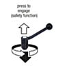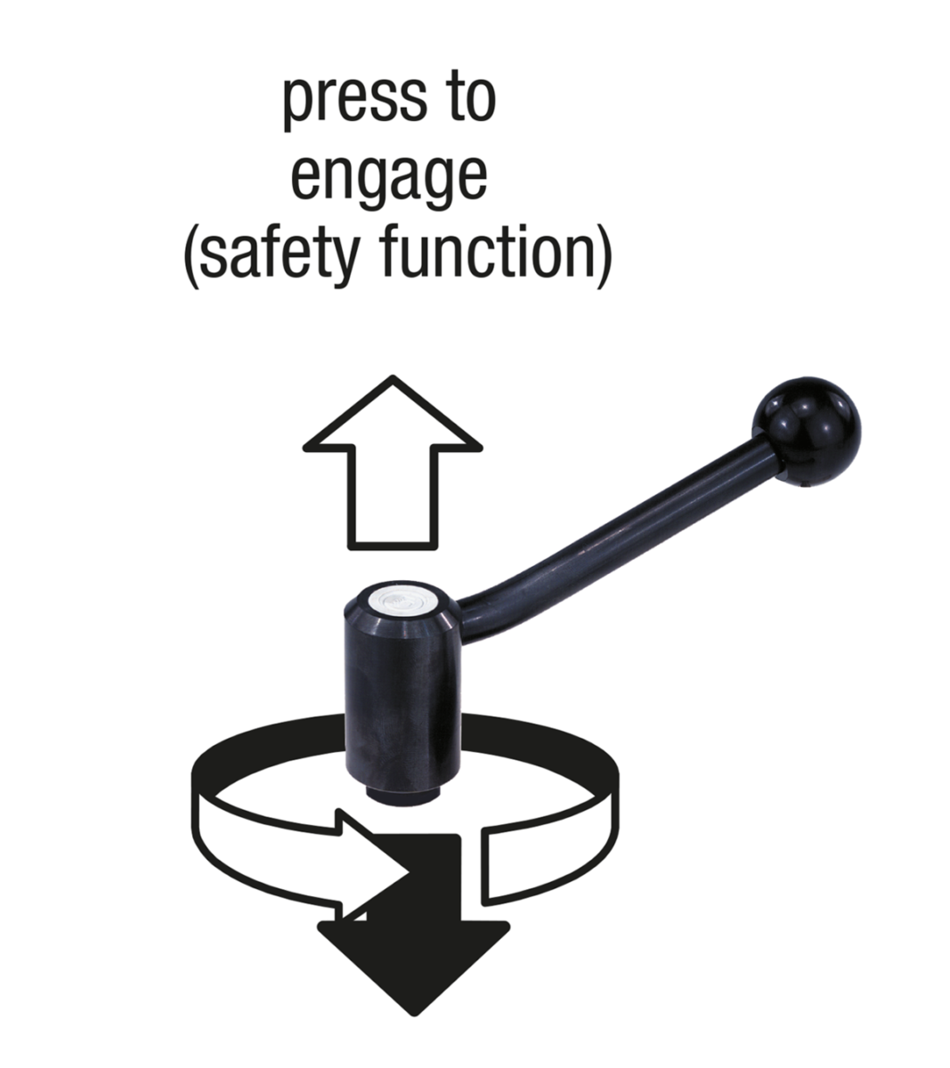 Press the handle down until the teeth are fully engaged. The object can now be clamped or released. Spring pressure pushes the handle up disengaging the teeth and thereby restoring the safety function (handle can be rotated without engaging).
