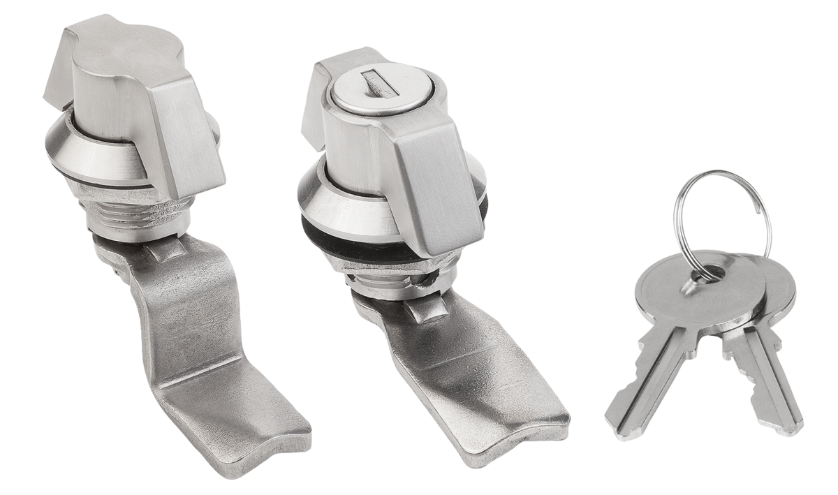 Quarter-turn lock with wing grip. For right or left mounting with 90° closing. The quarter-turn lock can be installed pre-assembled. Supplied with standard stainless-steel nut. The lockable quarter-turn lock is supplied with 2 keys. The key can be removed in both the closed and open position. The cylinder locks have a single-key system i.e. the same key works in all locks (lock type 1333).