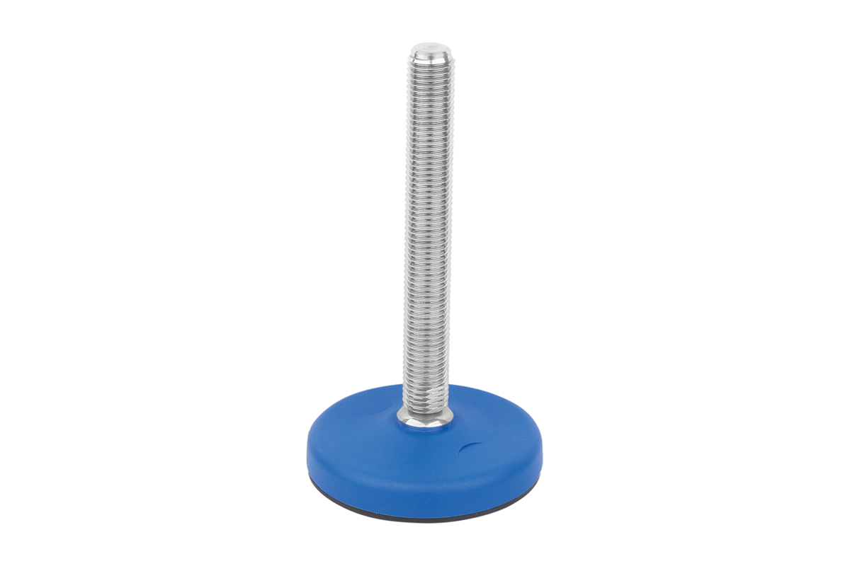 Levelling feet with stainless steel spindle, polyamide base and optional anti-slip plate. The anti-slip plate absorbs vibrations and prevents the swivel foot slipping.