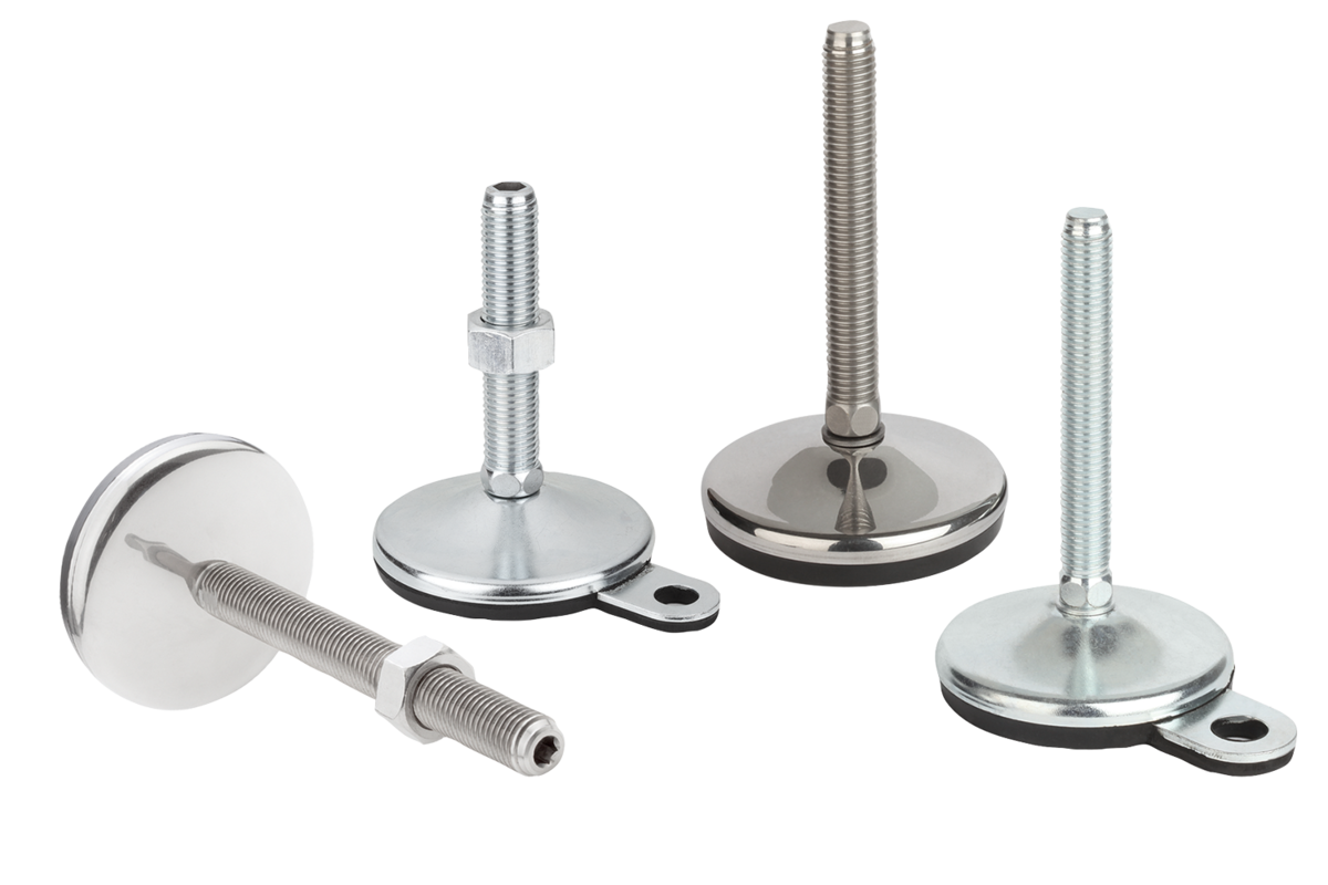 Levelling feet steel or stainless steel with pivoting threaded spindle and rubber base. The solid rubber base is permanently vulcanised to the sheet metal plate. The rubber base has an excellent surface grip. It is sound damping and impedes transmission of vibrations and impacts to the floor.