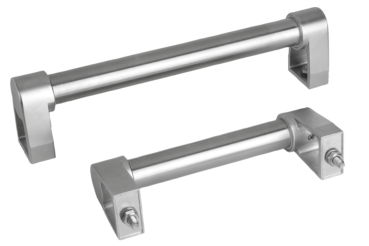 Maniglie tubolari universali componibili in acciaio inox. Collegamento tubo-supporto antispruzzo. Fissaggio per tubo supplementare tramite perno filettato con esagono incassato. Per montaggio con vite dalla parte anteriore o posteriore. Facili da pulire, particolarmente adatte per l'industria alimentare.