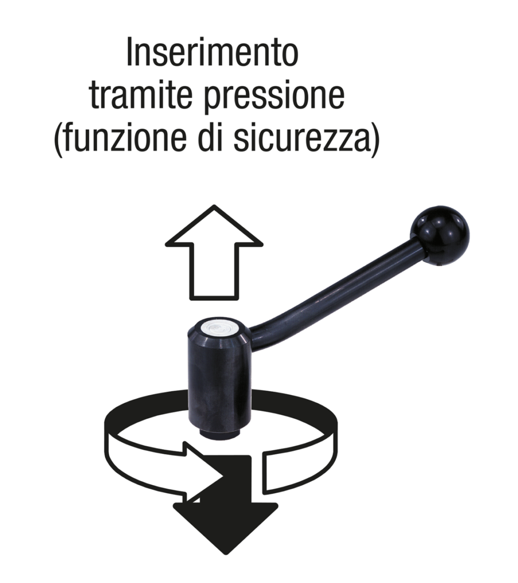 Per azionare le maniglie di serraggio di sicurezza, è necessario spingere fino a far scattare completamente in posizione la dentatura. Solo a questo punto è possibile serrare o allentare. La pressione della molla fa aprire subito il meccanismo di chiusura, in modo che la funzione di sicurezza sia nuovamente disponibile. (Si può agire sulla maniglia senza forzare.)