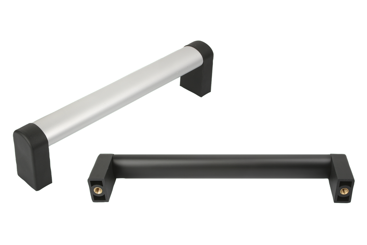 Maniglie con profilo ovale componibili. Modello con supporti in plastica e traversino a sezione ovale in alluminio.