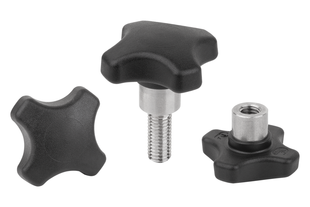 I pomelli a croce con boccola in acciaio sporgente con filettatura interna sono adatti soprattutto per i collegamenti a perno trasversale.